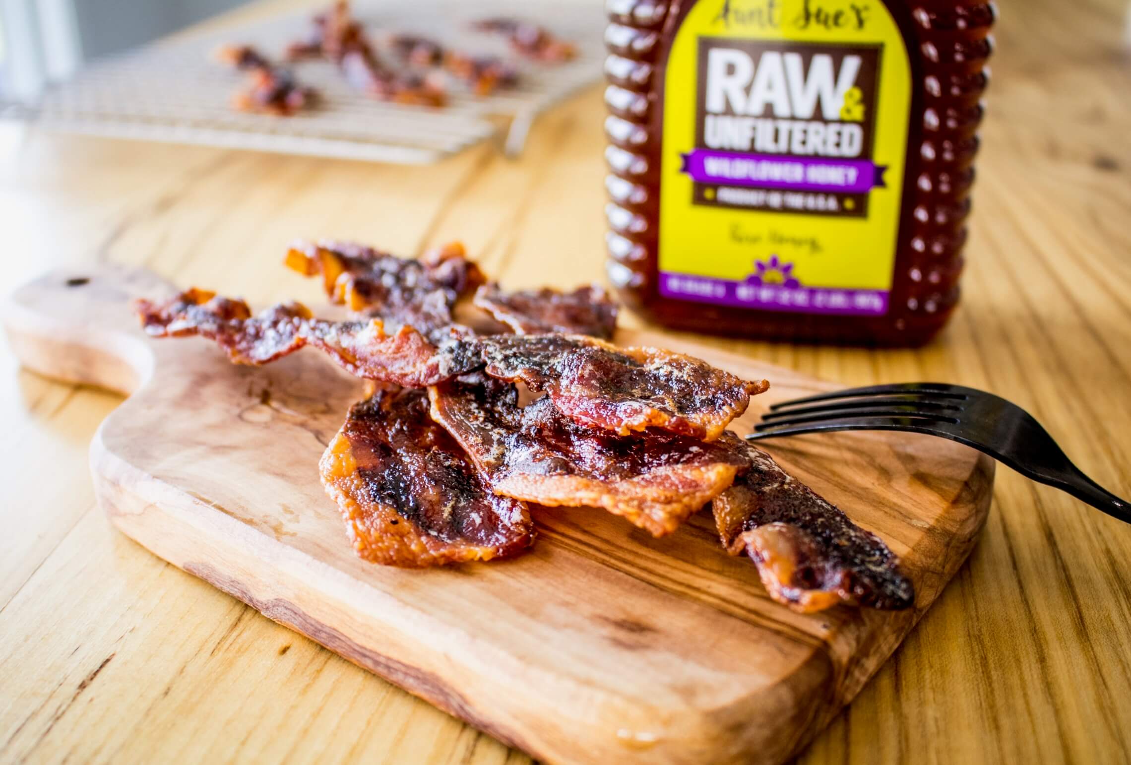 Remove from oven again, flip bacon and brush other side with the honey mixture, then continue baking for another five minute.
