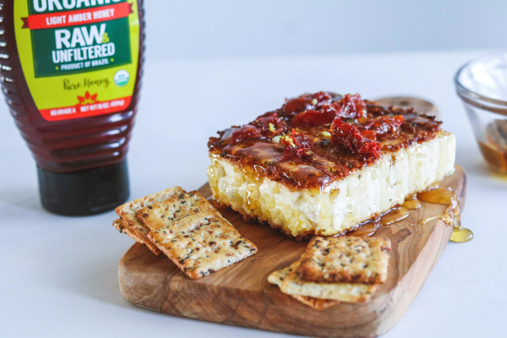 Beat egg in small bowl and spread panko breadcrumbs onto small plate. Dip entire feta cheese block into beaten egg, coating all sides. Then, place feta into breadcrumbs and cover well. Transfer cheese block into pan with heated oil. Fry both sides until golden brown and crusting. Remove from heat and top with sun-dried tomatoes and honey! Serve with crackers.