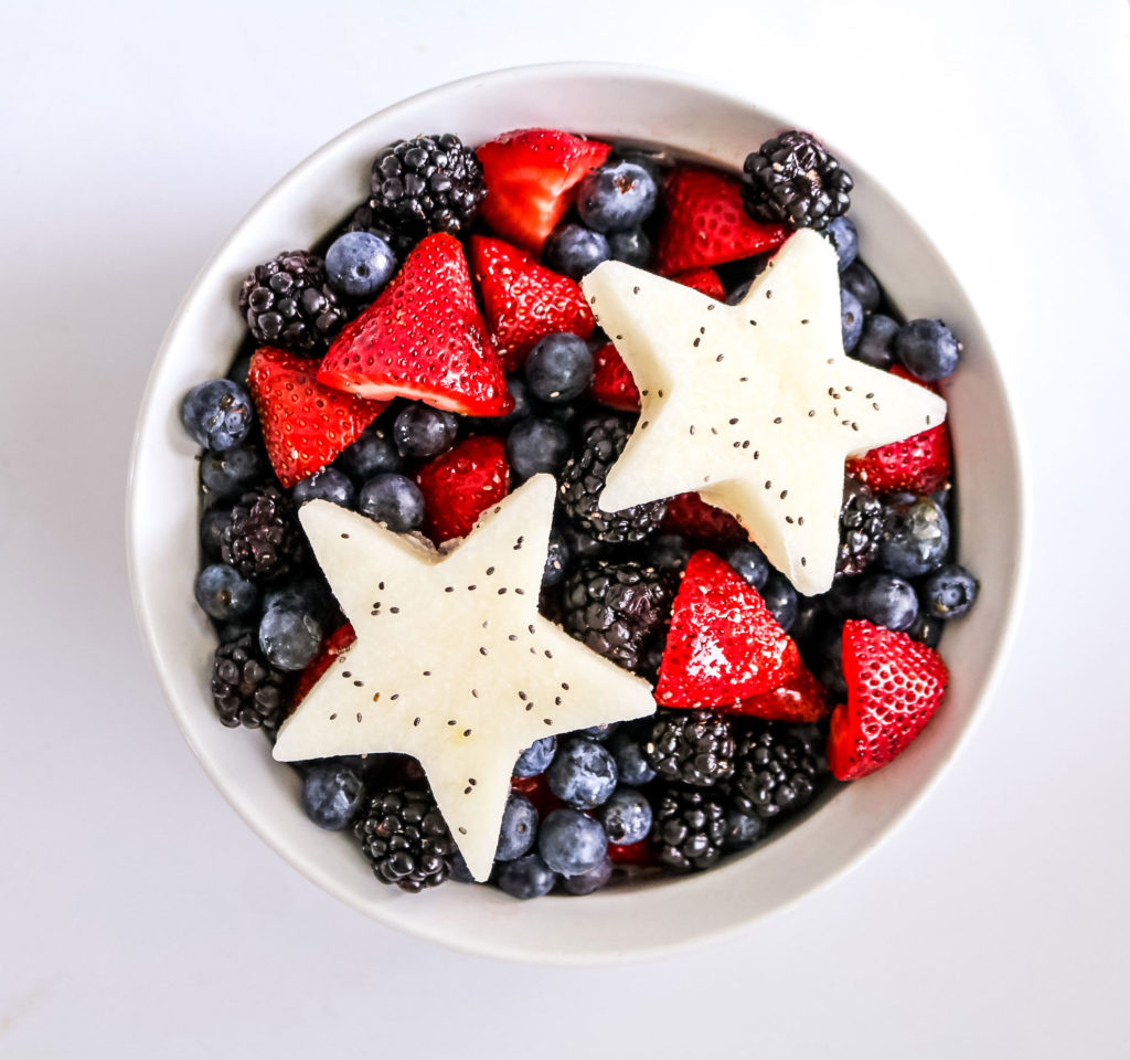 Cut jicama or dragonfruit into star shapes using a cookie cutter. Mix all fruit into large bowl and set aside. In smaller bowl, mix together honey, lime juice and chia seeds. Pour over fruit, toss and serve.